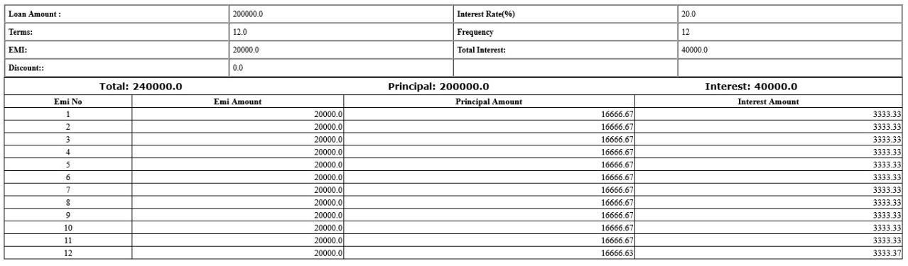 The principal amount is Rs 2,00,000 and the loan terms include an interest rate of 20% for 12 Months. Using the flat-rate method to calculate the EMI, the homeowner's monthly payments come out to Rs 20,000.Total Payment come out to Rs 240,000. Interest Amount is 40,000.